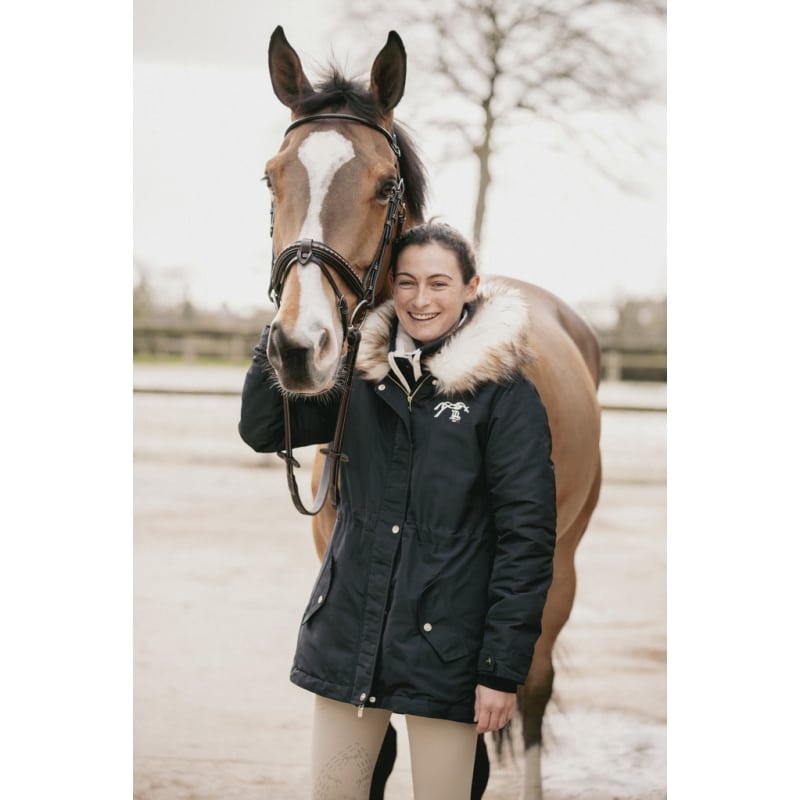 La parka Pénélope "Mega Lyon" est inspirée du célèbre bomber Lyon de la marque, ici revisitée en version mi-longue. Elle dispose d'un grand zip sur le devant, accompagné d'un rabat à pressions, et est doublée d'une épaisse couche de polaire ultra-douce. La capuche est entourée d'une élégante fausse fourrure. Cette parka est équipée d’un cordon de serrage à la taille et de deux poches latérales inclinées avec fermetures à pressions. Sa coupe est légèrement plus longue à l’arrière, avec une fente pour un confort optimal. Idéale pour les écuries ou pour la ville durant la saison froide.