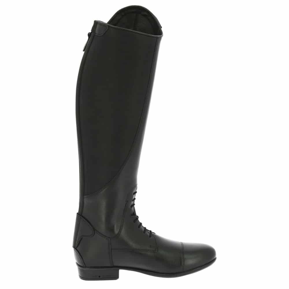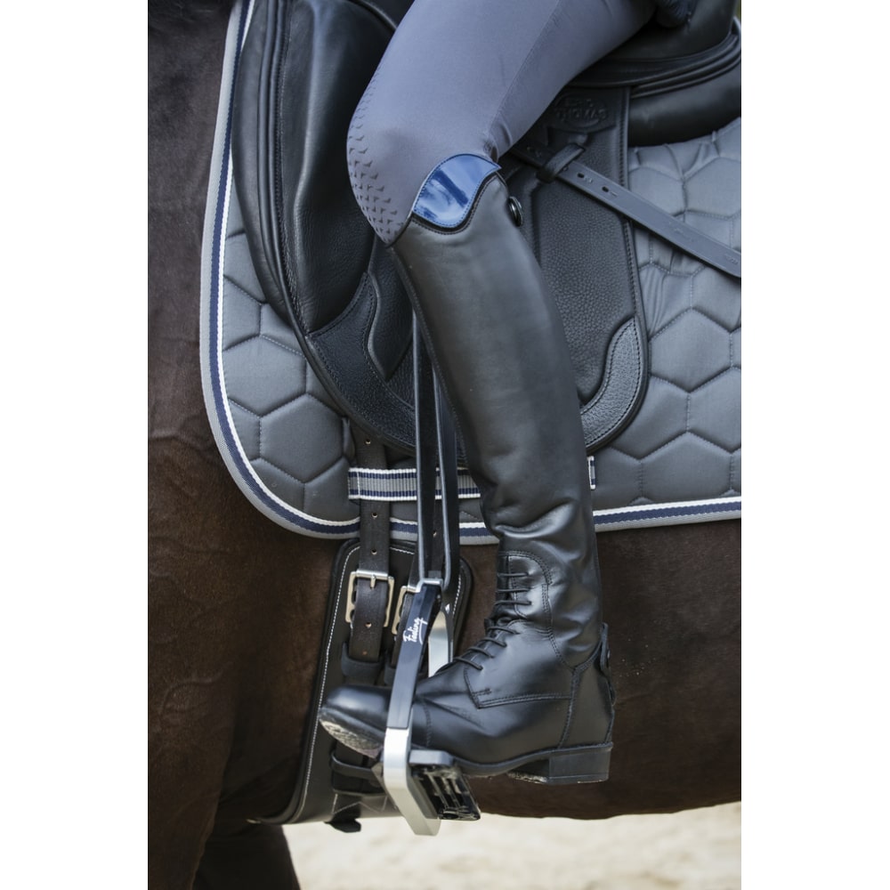 Les bottes Equithème MyPrimera sont conçues pour offrir un confort et une performance optimaux aux cavaliers. Fabriquées en cuir pleine fleur souple et lisse, elles combinent élégance et durabilité. Les lacets élastiques à l'avant et les surpiqûres ton sur ton en pointe ajoutent une touche d'élégance supplémentaire. La face intérieure en cuir gras permet une meilleure fixité du bas de la jambe, améliorant ainsi la stabilité et le contrôle pendant la montée.Ces bottes sont dotées d'une fermeture arrière YKK montée sur un support élastique, sécurisée par un bouton pression sur rabat en cuir en bas et sur le montant élastique en haut de la tige, facilitant ainsi l'enfilage et le retrait. La semelle extérieure antidérapante en caoutchouc est équipée d'une zone de confort en polyuréthane souple avec des picots, offrant une excellente adhérence et une absorption des chocs grâce au système de ventilation "Air System" qui favorise la circulation de l'air et l'évacuation de l'humidité.La première de propreté amovible en polyuréthane souple comporte des zones de répartition de la pression et un insert en gel amortissant antichocs au talon, procurant un effet coussin d'air pour un confort de marche amélioré. La voûte plantaire préformée et la doublure du pied en nylon et mousse, absorbante et respirante, limitent la transpiration et garantissent un confort durable.Les bottes MyPrimera sont également personnalisables avec des patchs interchangeables en strass noirs montés sur bande auto-agrippante, permettant aux cavaliers de customiser leurs bottes selon leurs goûts et envies.Pour l'entretien, il est conseillé de nettoyer le cuir avec du savon glycériné, d'appliquer un cirage ou un baume de couleur identique et de nettoyer régulièrement la fermeture éclair à l'aide d'une brosse?