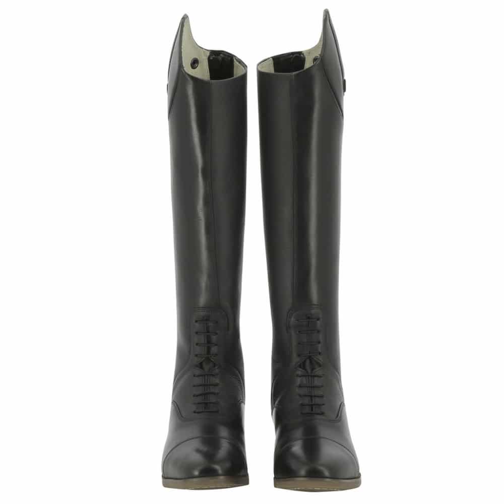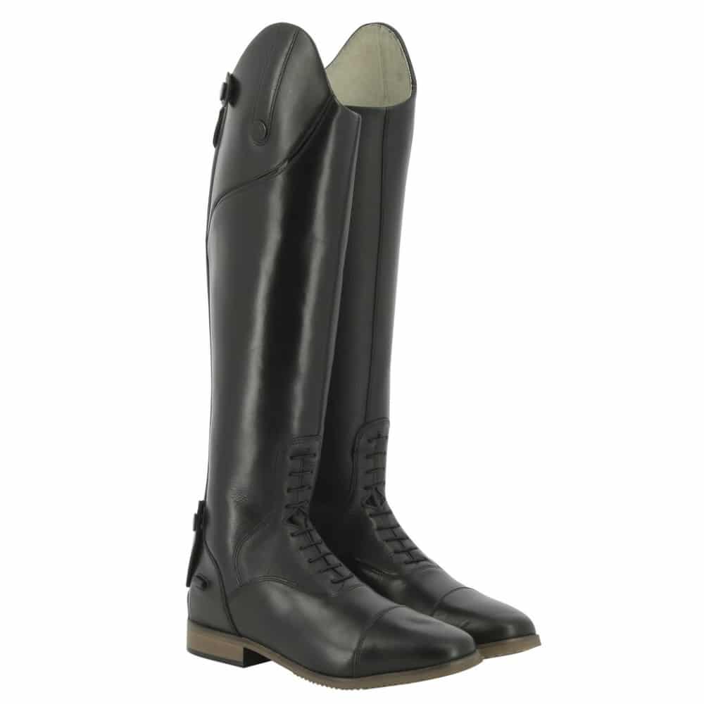 Les bottes Equithème Wavy sont fabriquées en cuir de vachette souple et lisse, offrant une grande durabilité et un aspect élégant. La fermeture à glissière arrière YKK, montée sur un support élastique, permet un enfilage et un retrait faciles, tandis que les lacets élastiques à l'avant assurent un ajustement parfait et une esthétique raffinée.Ces bottes sont dotées d'une face intérieure en cuir gras, améliorant la fixation du bas de la jambe et offrant un meilleur grip pendant l'équitation. La doublure en cuir de porc sur toute la hauteur de la botte, associée à une première de propreté amovible en polyuréthane souple, garantit une excellente absorption de l'humidité et un confort durable. La semelle Néolite cousue Blake, combinée à un talon en Masonite, assure robustesse et effet antidérapant, idéal pour les terrains variés.Les bottes Equithème Wavy sont particulièrement adaptées aux cavaliers recherchant des bottes polyvalentes pour l'entraînement et les compétitions. Elles sont disponibles en plusieurs tailles et largeurs de mollet, offrant un ajustement sur mesure pour chaque cavalier.Pour l'entretien, il est conseillé de nettoyer régulièrement les bottes avec un savon glycériné et d'appliquer un cirage ou un baume de couleur identique pour maintenir le cuir en bon état. Les fermetures éclair doivent également être brossées régulièrement pour éviter l'accumulation de saleté?