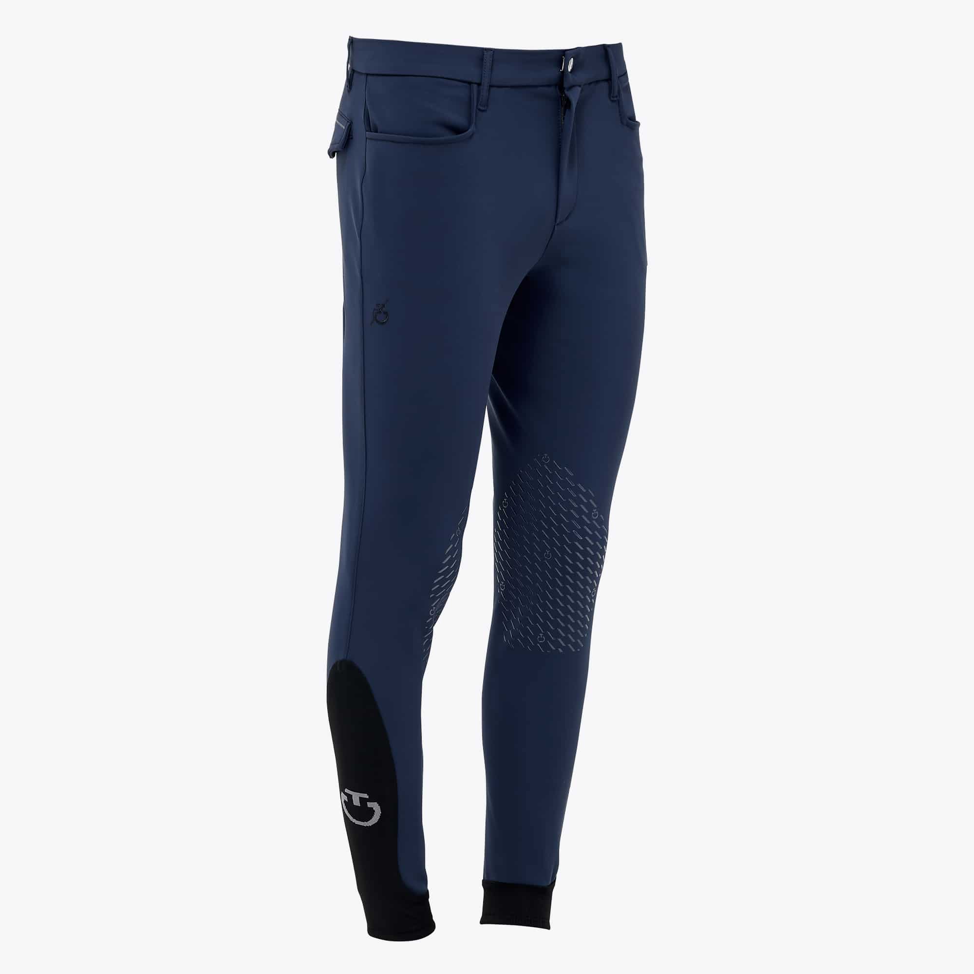 Le pantalon d'équitation pour homme CT Dash de Cavalleria Toscana est conçu pour offrir un confort et une performance inégalés aux cavaliers. Fabriqué à partir d'un tissu technique extensible dans quatre directions, ce pantalon garantit une grande liberté de mouvement tout en maintenant une respirabilité optimale. Ce matériau innovant est également anti-bactérien, anti-UV, et sèche rapidement, ce qui en fait un choix idéal pour les compétitions et les entraînements intensifs.La conception inclut des détails en silicone à l'intérieur des genoux pour assurer une adhérence maximale, empêchant le glissement en selle et offrant ainsi une stabilité accrue. La ceinture haute, garnie d'une bande antidérapante, maintient votre chemise en place pour une apparence soignée et professionnelle. Les poches arrière avec rabat et bouton sont personnalisées avec le logo Cavalleria Toscana, ajoutant une touche de style et de sophistication.Le pantalon est également doté de "chaussettes" élastiques au bas des jambes, ce qui facilite le port des bottes et assure un ajustement confortable sans plis. Disponible en plusieurs couleurs classiques telles que le noir, le bleu foncé et le turquoise, ce pantalon s'adapte à toutes les préférences esthétiques et toutes les disciplines équestres.