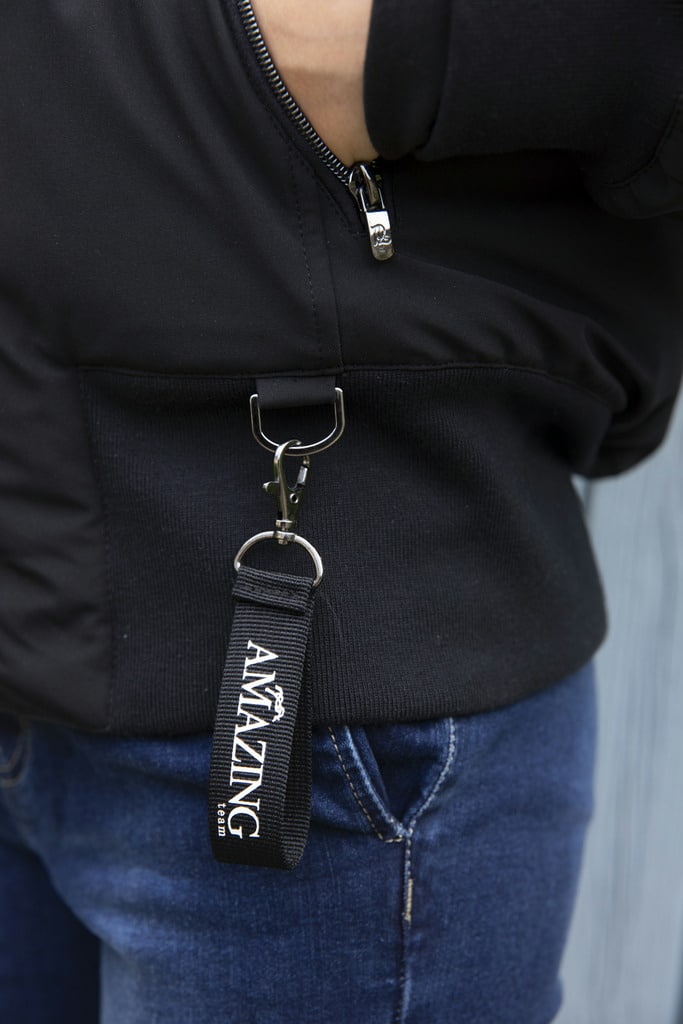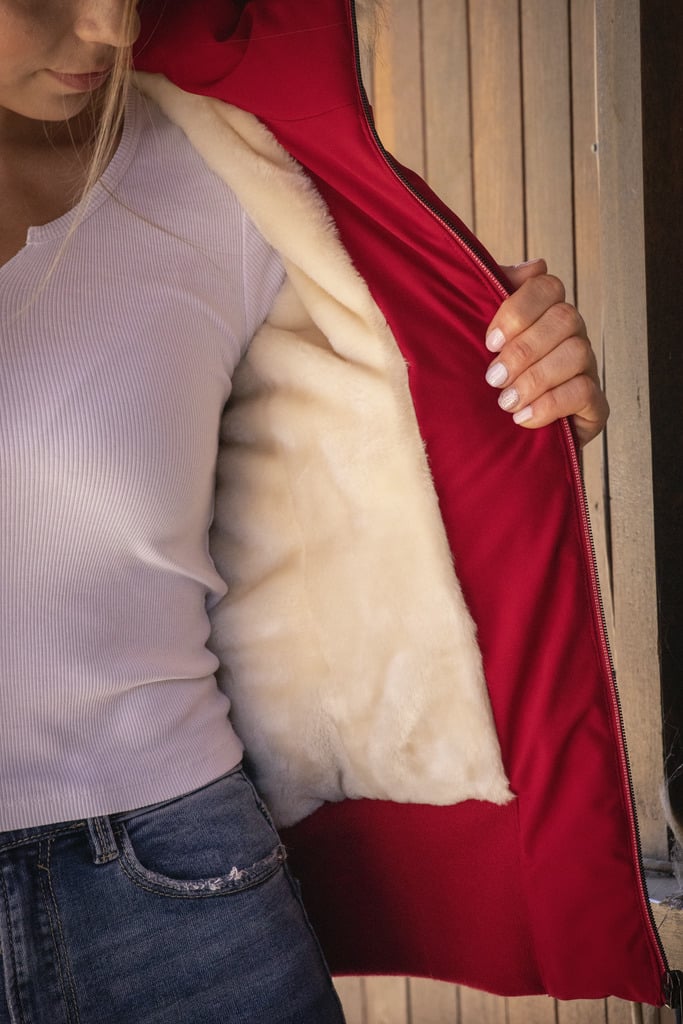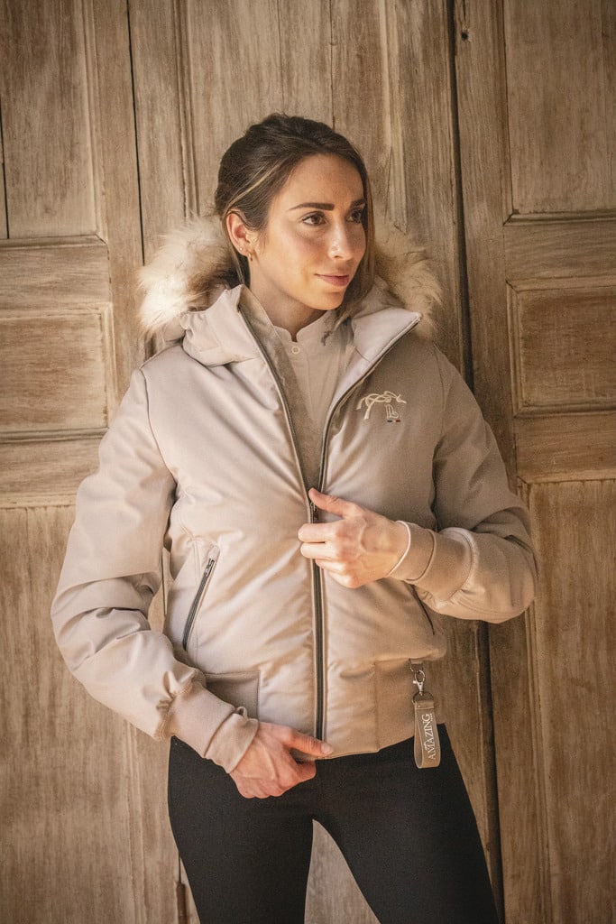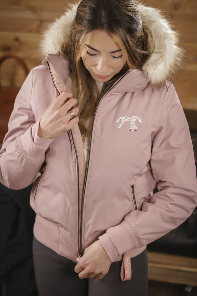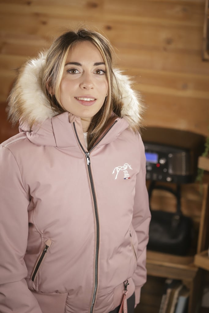 Le blouson Pénélope Step fait partie de la collection Pénélope et est conçu pour garder les cavalières au chaud durant les mois froids. Ce bombers court est doté d'une matelassure épaisse et d'une doublure en polaire, garantissant une isolation maximale. Sa capuche, entourée de fausse fourrure et détachable, ajoute une couche supplémentaire de protection contre le vent et la pluie.Caractéristiques principales :Matériaux de haute qualité : Le tissu principal est composé de 90% polyester et 10% élasthanne, tandis que la doublure et le garnissage sont à 100% en polyester. La fausse fourrure est faite de 80% d'acrylique et 20% de polyester.Design fonctionnel : Deux poches zippées pour garder les mains au chaud et un porte-clés décoratif détachable accroché à la poche.Confort : Large bande élastique à la taille et aux poignets pour une meilleure isolation contre le froid et un ajustement confortable.Entretien facile : Lavable en machine à 30°C, mais doit être évité au sèche-linge.