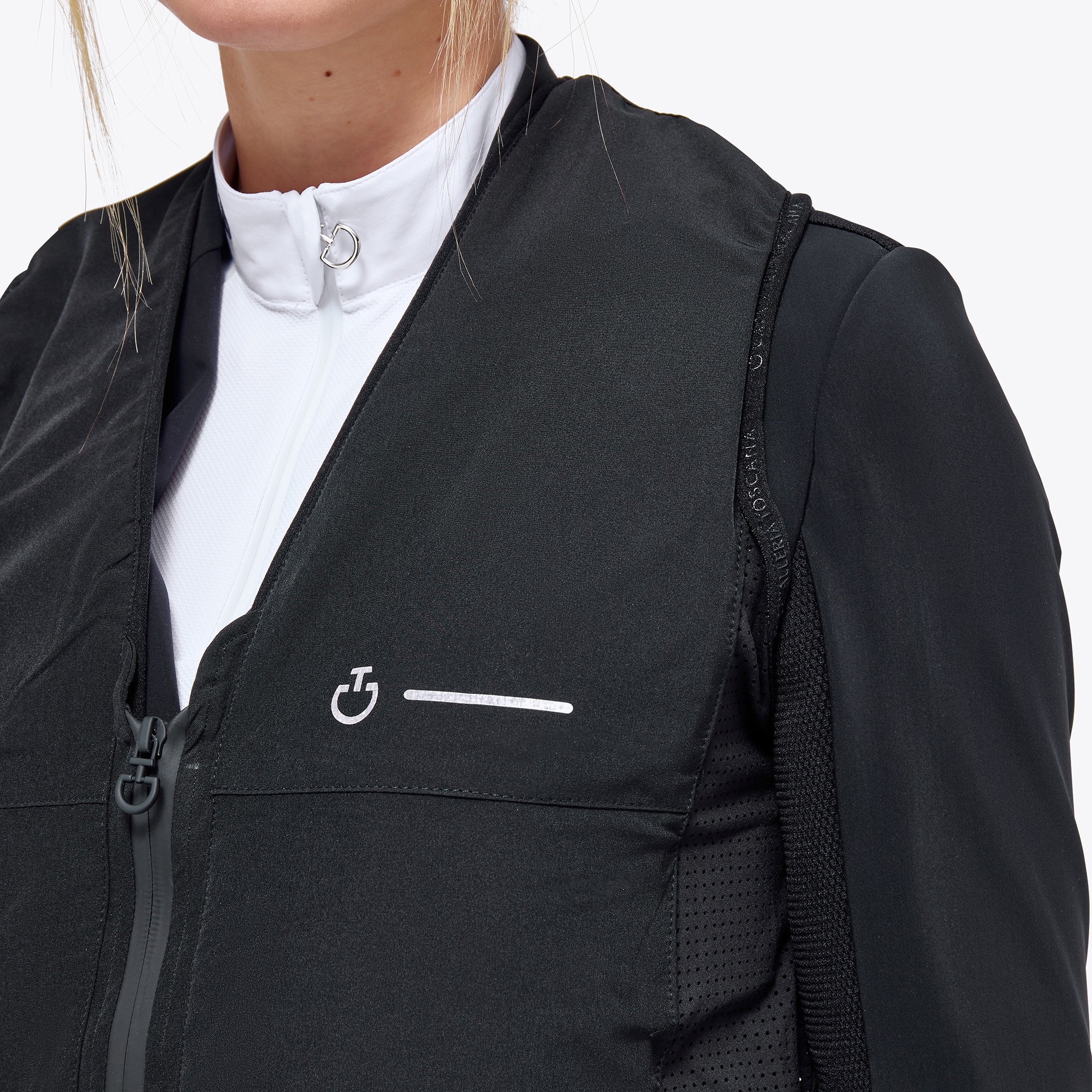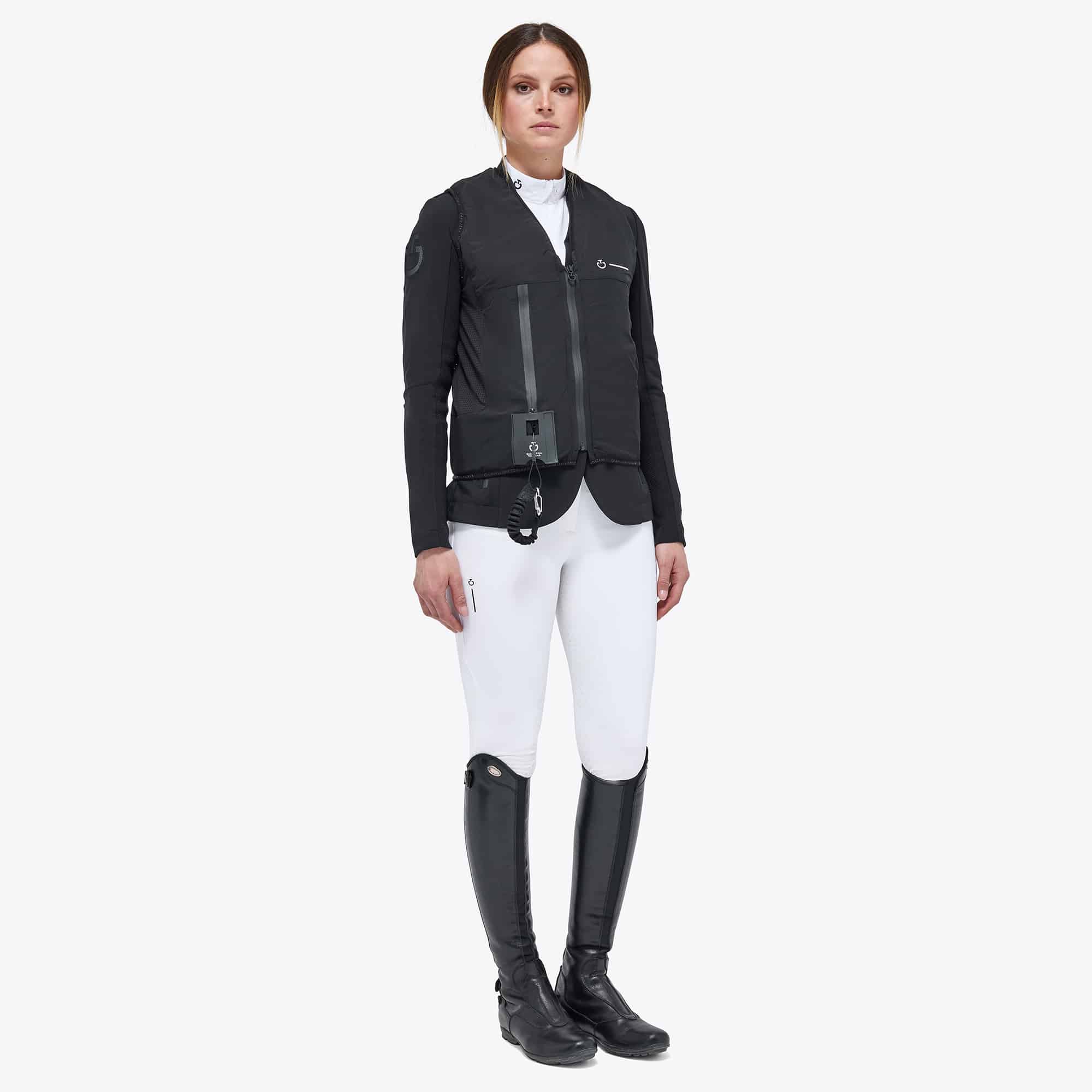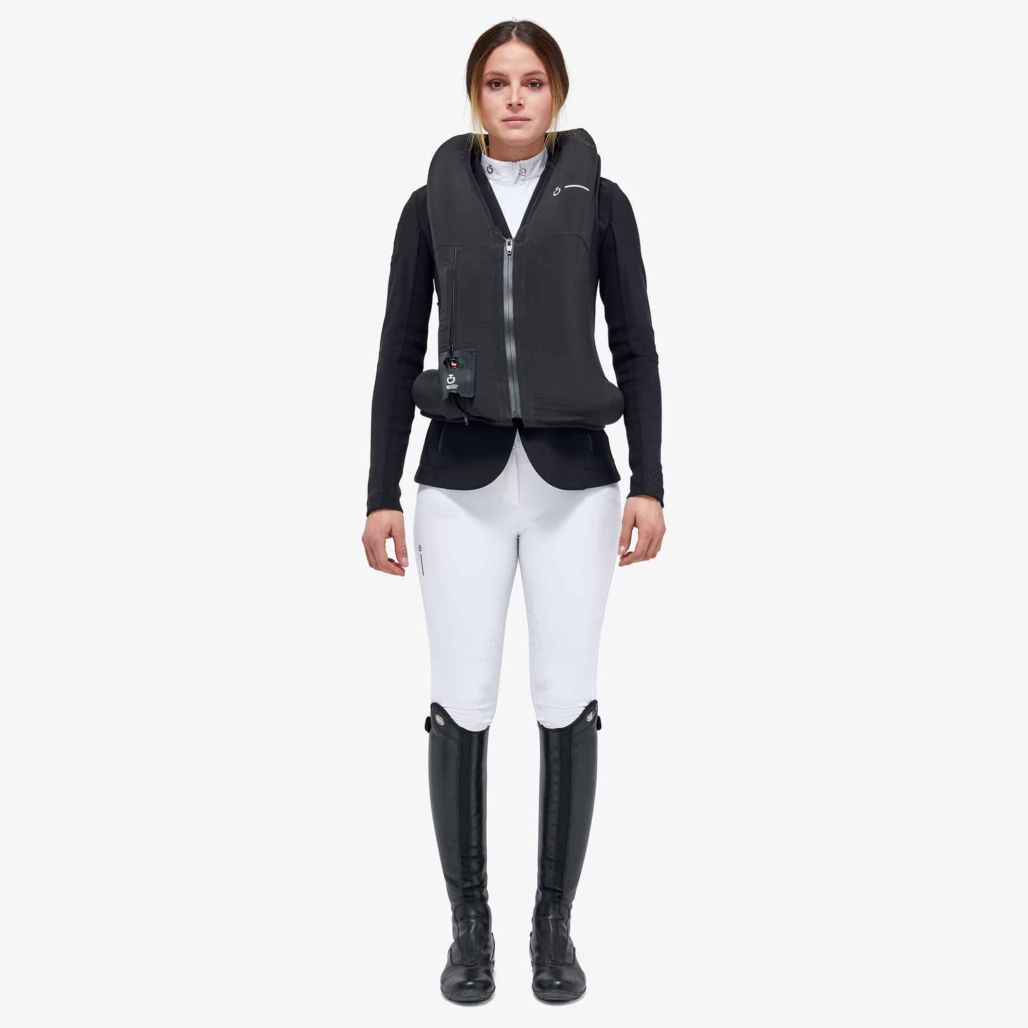 Le gilet CT R-EVO de Cavalleria Toscana, réalisé en collaboration avec Seaver, est un équipement de sécurité avancé destiné à protéger les cavaliers lors de chutes. Ce gilet utilise une technologie d'airbag qui se déploie en quelques millisecondes pour protéger les zones vitales telles que le dos, le cou, la colonne vertébrale, les côtes et le bassin. Cette activation ultra-rapide est rendue possible par un mécanisme relié à la selle du cavalier, qui déclenche le gonflement en cas de chute.Le gilet est fabriqué à partir de matériaux légers et respirants, assurant un confort optimal même lors des longues séances d'équitation. Il est également conçu pour être porté discrètement sous ou par-dessus une veste de compétition, sans compromettre le style ou la liberté de mouvement. Le gilet CT R-EVO est certifié selon les normes de sécurité les plus strictes en Europe, notamment la norme NF S72-800:2021, garantissant une protection maximale.Les utilisateurs apprécient particulièrement la combinaison de protection, de confort et de design élégant qu'offre ce gilet. De plus, il est facile à entretenir et les cartouches de CO2 nécessaires pour le fonctionnement de l'airbag peuvent être facilement remplacées après utilisation.
